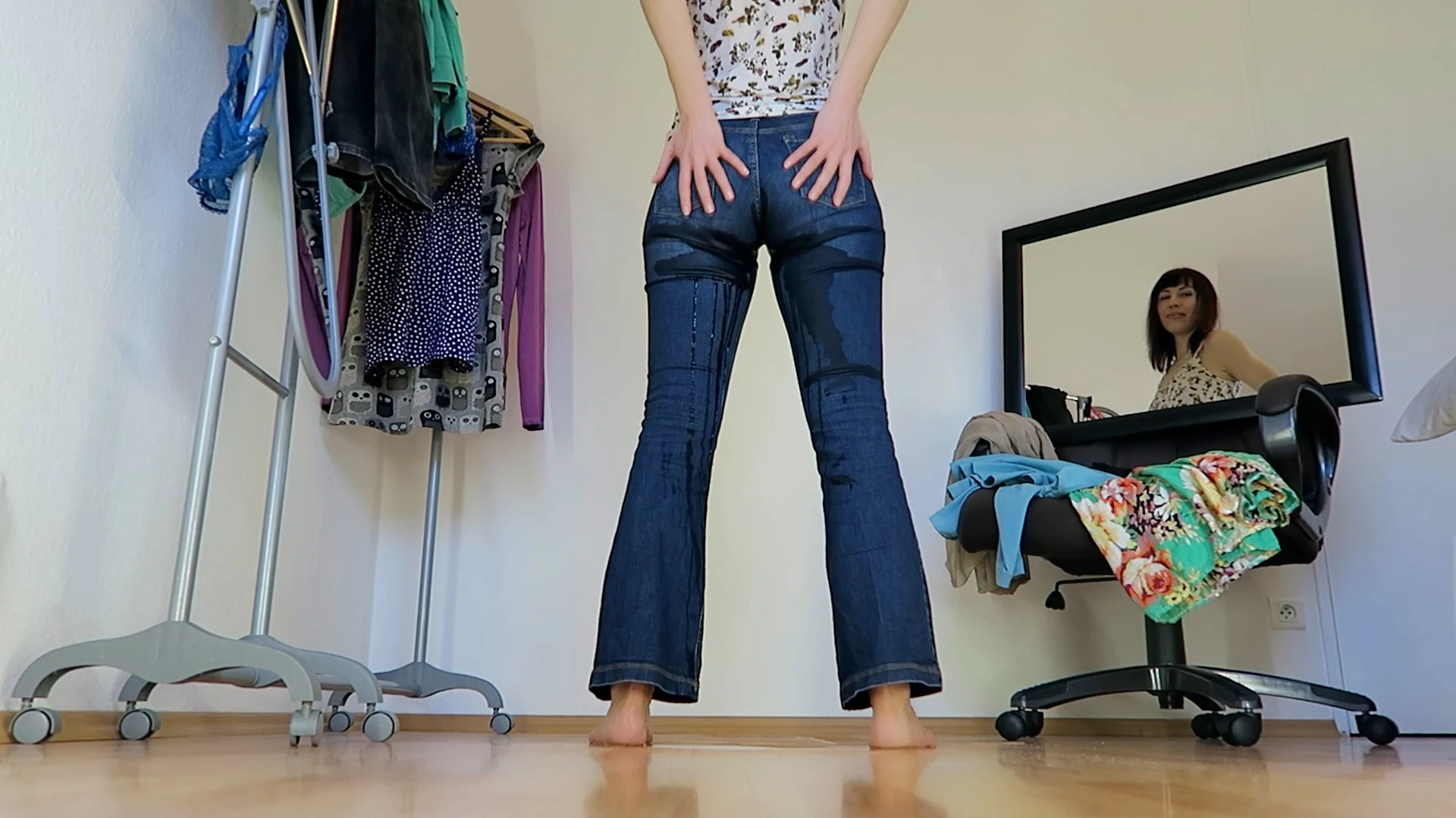 It's a custom roleplay video. The idea is that I'm invited to the party and thinking what to put on, I choose a pair of jeans and don't know which top will match. I start with a pair of yoga pants and a T-shirt on, try a bra, a couple of different panties, put a pair of blue jeans on. I don't know which top to choose though. Finally, I find what I want to wear. I'm ready for the party. But I really need to pee. I have some time before leaving home left, so I decide to wet a pair of jeans I have on already and to wear a black pair later. The first 13 minutes you have a top down view and the rest of the video down top view. I wet my pants, pulling them down a bit and play with my wet pussy, pulling jeans back on and tease myself a bit more. Keep in mind that there is not much nudity in this clip