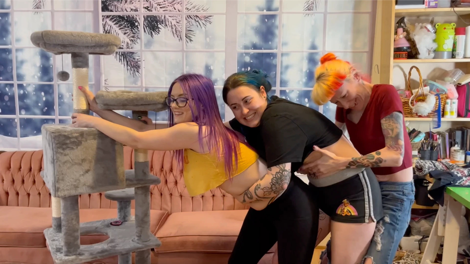 I get stuck trying to move the scratching post- because its so damn heavy!!! my friend ondreeah helps, but we truly can barely make it nudge! in our crop tops and low pants we struggle endlessly, until we have no choice but to ask our pal summer to try and help too!! we all struggle and pull and swap spaces and pull some more and it isnt until the bitter end when were ready to get up that we manage to succeed in pulling the scratching post!