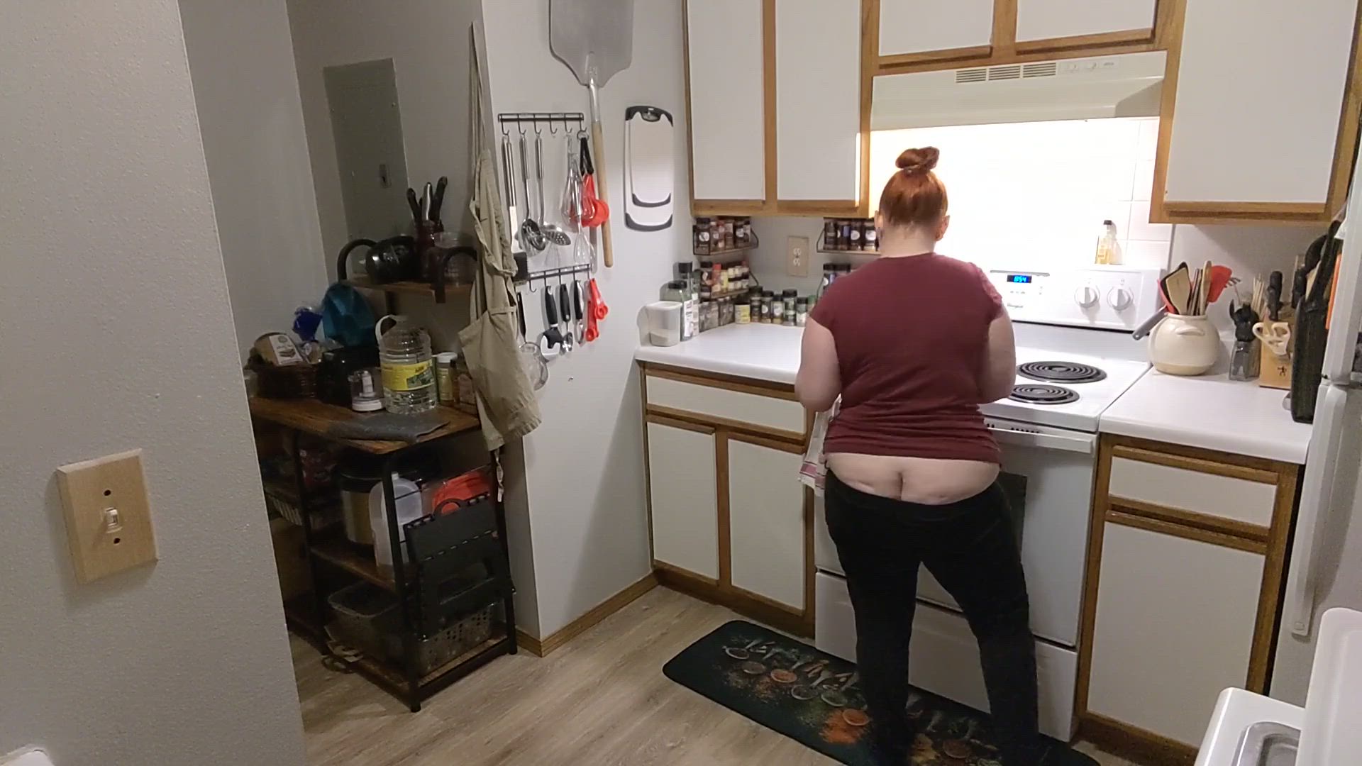 "Unaware Housewife Cleans Kitchen with Buttcrack Exposed" - This kitchen always gets so filthy so quick! It needs a good scrubbing. Unbeknownst to me, while I am cleaning my kitchen, my leggings begin to slide down. Little by little, more of my long buttcrack is exposed. I didn't even realize you...