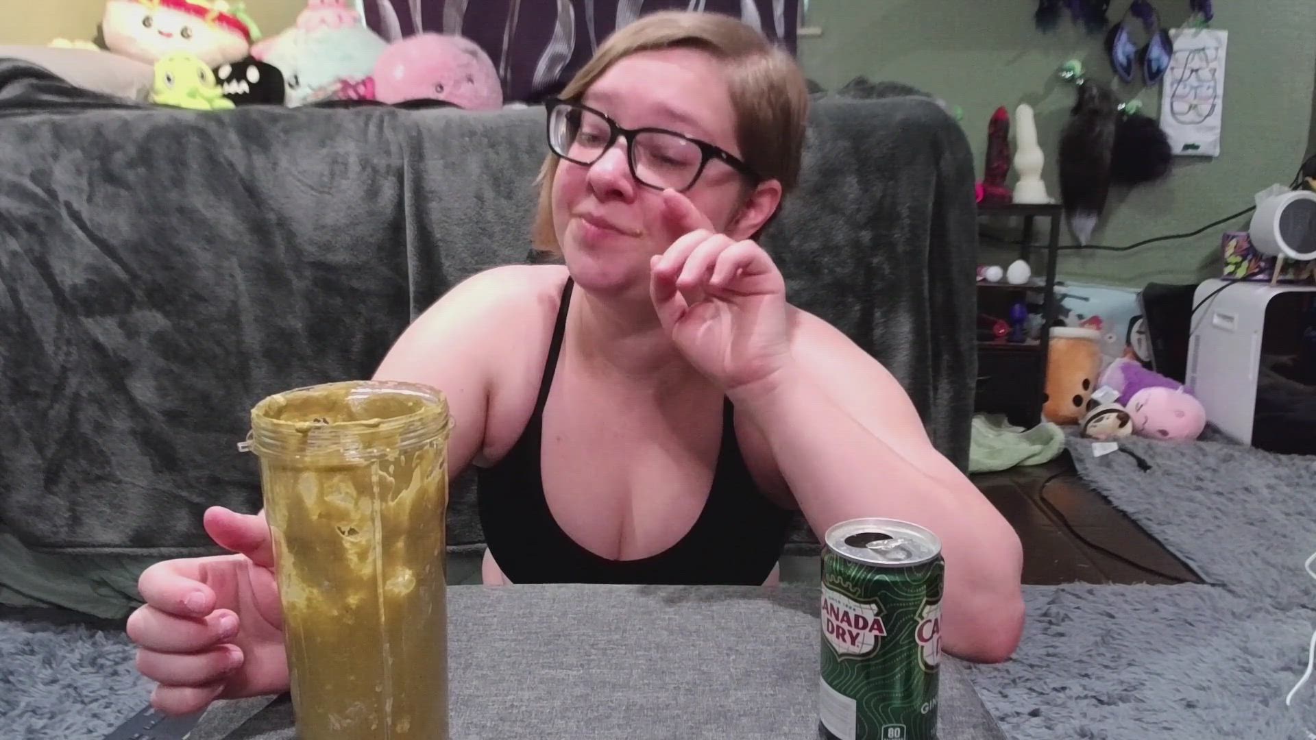 Pixie needs some after workout smoothies and decides to whip up a veggie smoothie and then a protein smoothie. The veggie smoothie is made of mayo, blue cheese dressing, canned carrots, canned peas, canned spinach and blue cheese chunks. The protein smoothie is made of canned tuna, canned clams, smoked sardines, potted meat and canned vienna sausages. Yum yum! --- This was a custom video! Want your own? Check out my custom video form! : )