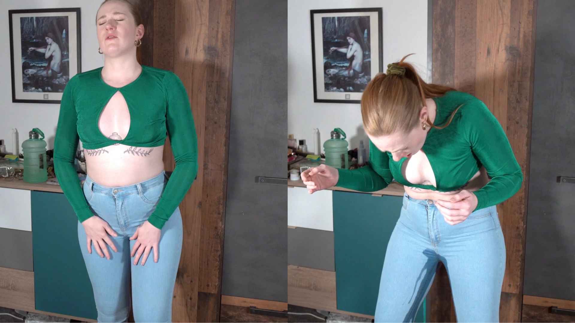 Fiona gets trapped in her bedroom with a very full bladder! Once she realizes nobody is going to let her out to use the bathroom, she tries desperately to hold it - panicking and bouncing around and trying to keep it in; but after a while she just can't hold it any longer and pees herself in her jeans!