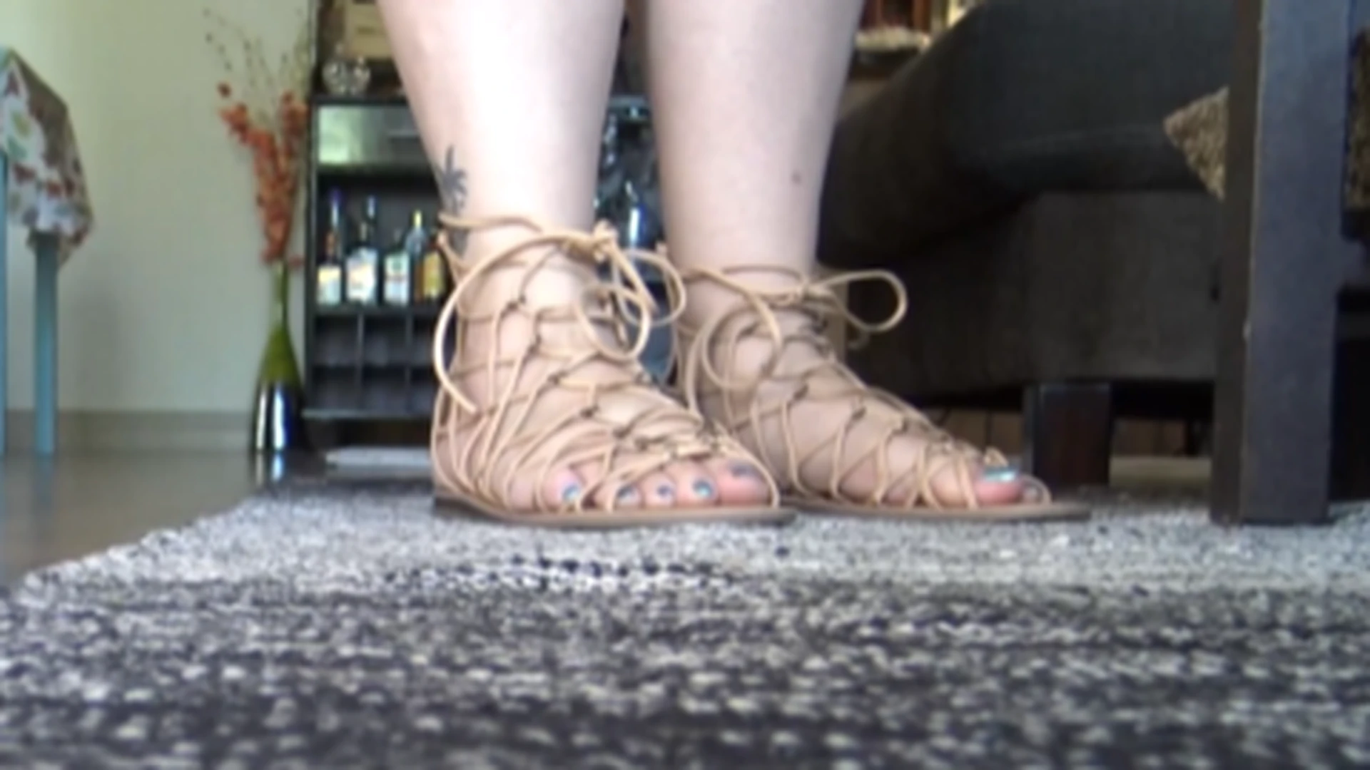 You giggle from behind the shelf, loving the view of her gladiator sandals.